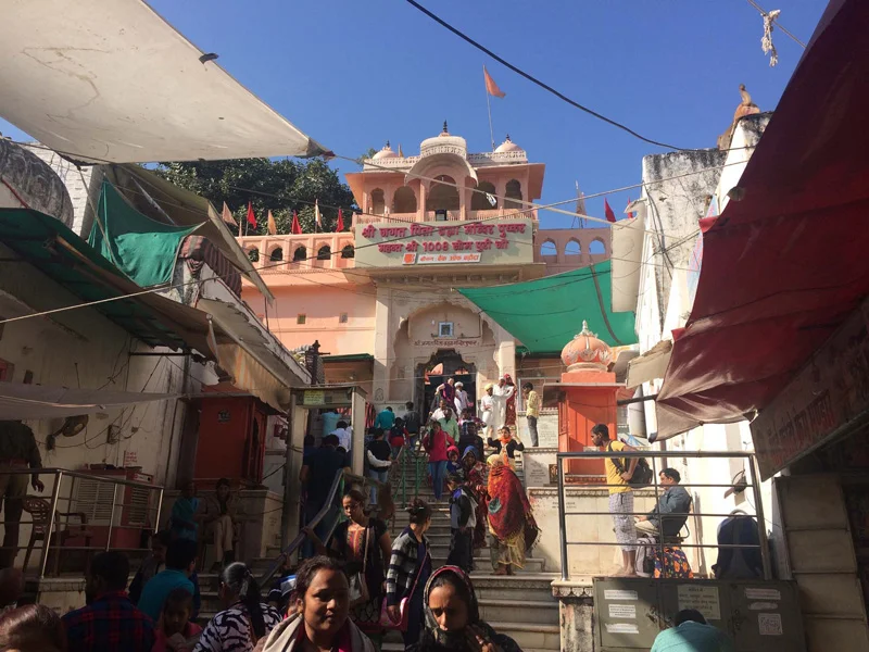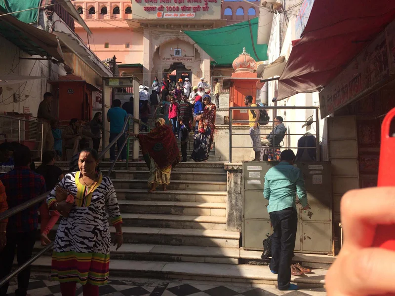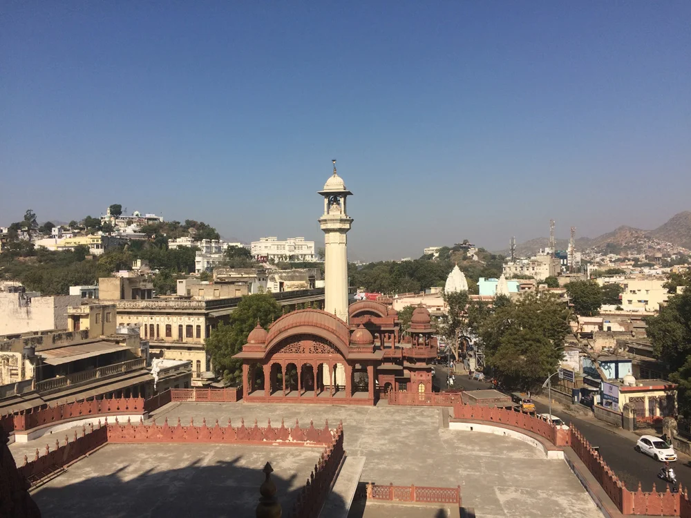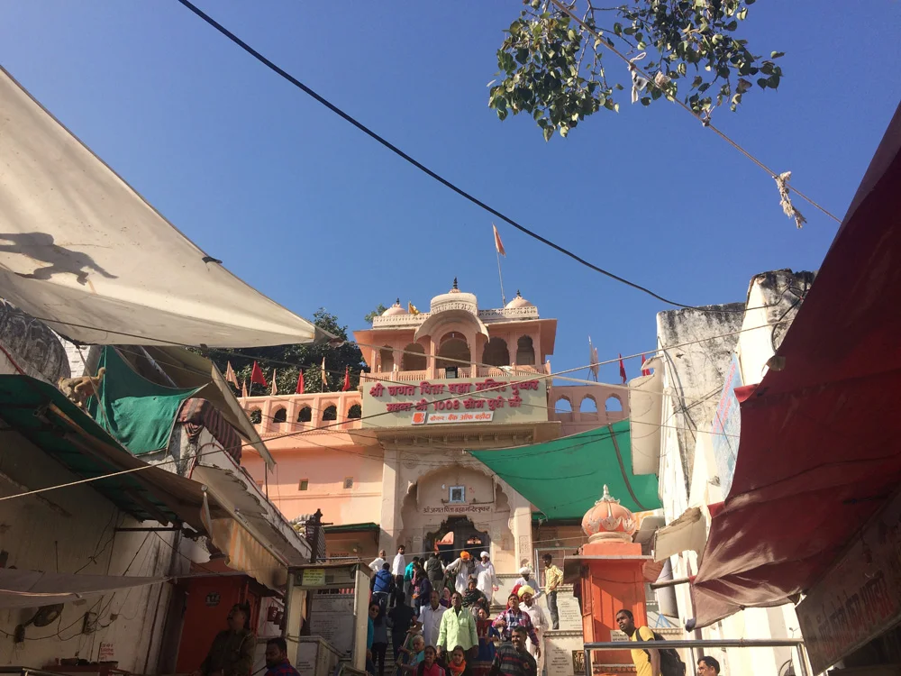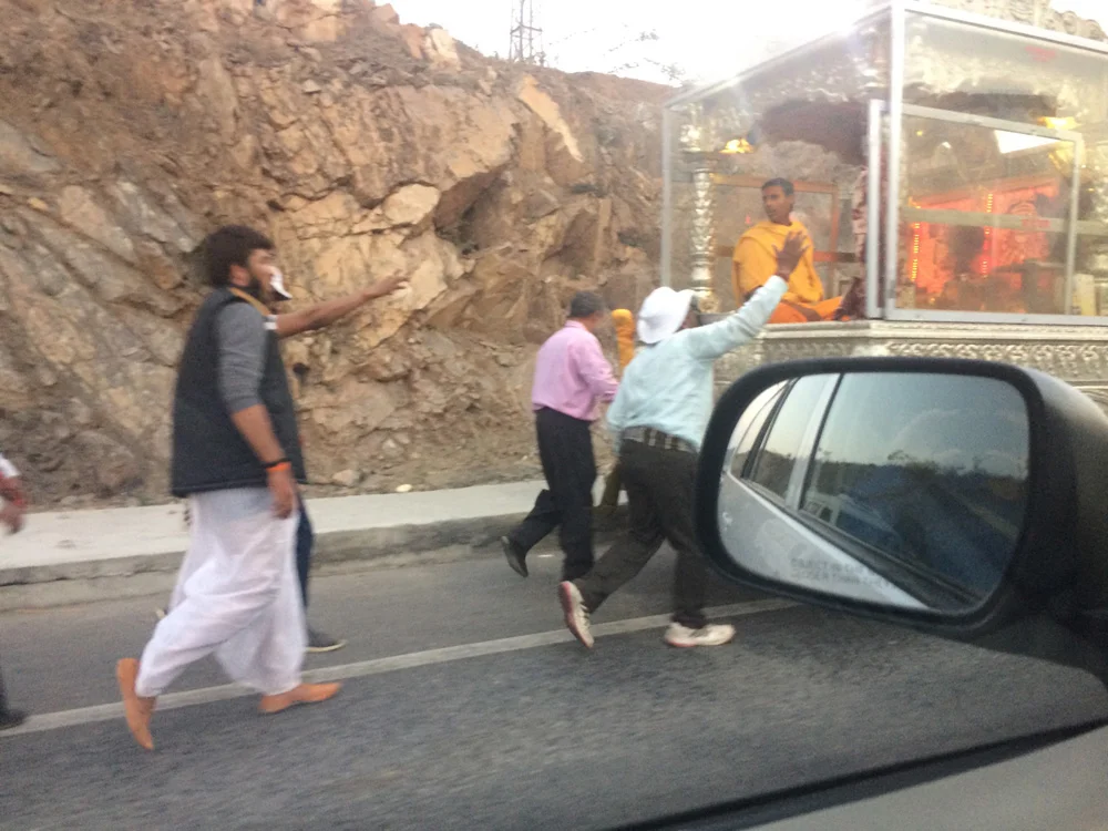 We made a stop in Ajmer at a very interesting monument of the Jain faith called Soniji Ki Nasiyan or Siddhkoot Chaityalaya. The Ajmer Jain temple contains in its sanctum 1000 kg of gold to carve out depiction of Ayodhya which is birthplace of five tirthankaras or Jain Gurus and the story of Rishabha. The Jain faith is a fascinating and beautiful part of Indian spiritual culture which would be an ever present theme on this trip not by any direct effort as we would visit Jain holy sites, participate in Jain parade and later be lovingly adopted by a Rajasthani Jain family in Rishikesh. The central tenet of nontheistic and non-orthodox Jainism is Ahimsa (Non-violence) having two main sects Digambara and Svetambra. The Digambaras and Śvētāmbaras have different views on ascetic practices and the difference can be seen mainly in that Digambara, which actually means nude by body, mind and speech are just that, completely naked. When traveling through Rajasthan we saw many renunciate Svetambra Jains covered in white cloth robes from head to toe on pilgrimages gently sweeping the way in front of their feet as to not injure any insects. Jain traditions are based around non violence and non attachment. They are vegetarians and adhere only to harvesting vegetables in a manner that will not kill the plant from which the vegetable is harvested. But religious Jains will do everything possible to prevent hurting any being. They won’t walk in fields where there are insects to prevent the possibility of stepping on them. They also cover their mouth to prevent the possibility of swallowing small invisible microbes. They mostly do not work in professions where there is a possibility of killing any living being like in agriculture instead professions like banking and business. I became fascinated by Jains and learned more about them in our time in India then in my lifetime paralleling their philosophies to my study of Yoga and Vedanta enriching my own spiritual practice.