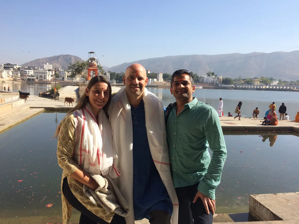 From Jaipur we decided to take a road trip across some great sites in Rajasthan. We were so excited to visit Pushkar first as part of our tour - we had heard such great things and wanted to visit the famous lake and pilgrimage site for Hinduism. According to Wikipedia: "Legend has it that the lake was consecrated to Lord Brahma, the creator of the Universe, when a lotus dropped from his hand into the vale and a lake emerged in that place." We first visited the Brahma Temple that dates back to the 14th century and is one of the few remaining temples to Brahma (the Hindu Creator-God) in all of India. Once bringing our offering there we headed to the lake where we were guided by a priest in a 20-minute ceremony that involved making offerings to the lake of coconut, rose water and flowers and finished with a tying of red string around our wrists (Julio's on the right; mine on the left). The string-tying practice is called Kalava and is tied with mantras (or prayers) to remind the wearer of the Satvic state (or the quality of balance and wholeness). This is in opposition to the polar extremes of human qualities that includes Rajas (passion, activity) and Tamas (destruction, chaos) which all together make up the Gunas (the whole system). All of this is deeply tied into yogic and Hindu Samkya Philosophy so I won't go into it all here but if you are interested check out the links. The various prayers we offered were for us, for our families back home and for all of creation. It was a beautiful ceremony and we felt honored to partake in it. I was especially glad that Polo was there to participate with us and to guide us to this as we might not have known about this otherwise.