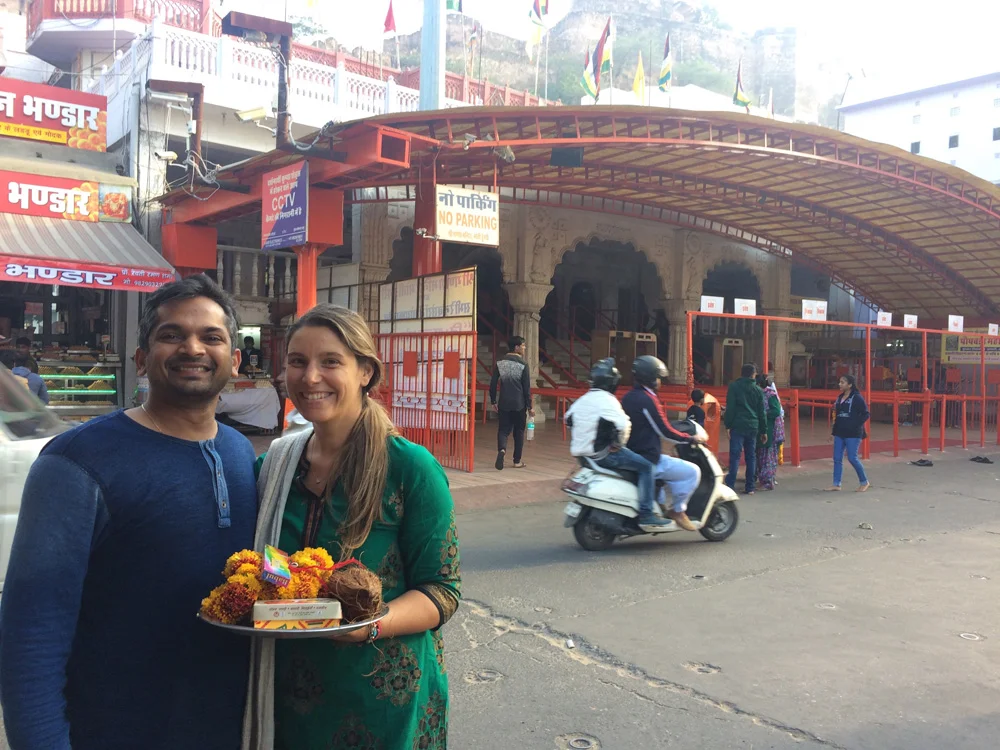 The process of going to an Indian temple is a beautiful ritual. Typically you bring an offering of sweets, fruits or delicacies and there are shops surrounding the temples to acquire these offerings easily and affordably. You arrive, remove your shoes, enter the complex, give your offering to the mendicants and usually you are given a marking on the forehead and string to tie around your wrist or to leave somewhere in the temple. You ring the hanging bell while entering into the sanctum to announce your presence to the gods. There are usually murtis, figures or some kind of representation of whichever deity the temple is dedicated to and some bow, pranam (fully extend in prostration on the floor), simply pray, chant or just hang out in the space. There is no hard and fast rule and its up to each person and their choice how the approach or pray. The temples do Aarti or fire offerings along with pujas, chants and hymns on the hour to honor the murtis and please the Gods accompanied by the ringing of bells.